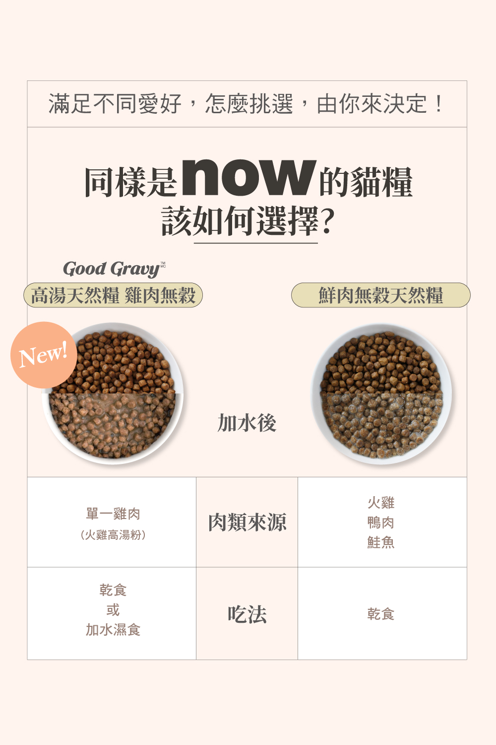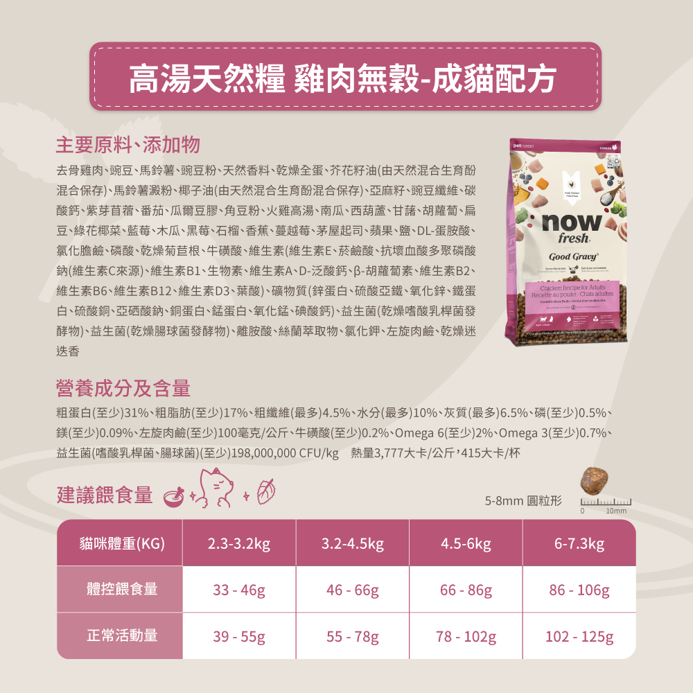 新鮮去骨肉塊製成的貓糧,外層包覆火雞高湯粉,香氣double、美味加分,是挑嘴貓咪最愛的選擇。 特別適合:挑嘴或平時不愛喝水的貓咪 TIPS:加水形成如燉飯的質地,不僅美味還補水。 乾乾直接吃或加水食用都講究 新鮮去骨放牧雞肉,肉質精實 牛磺酸保健心臟和視力 規格 建議售價 3B $1,840 8B $3,160