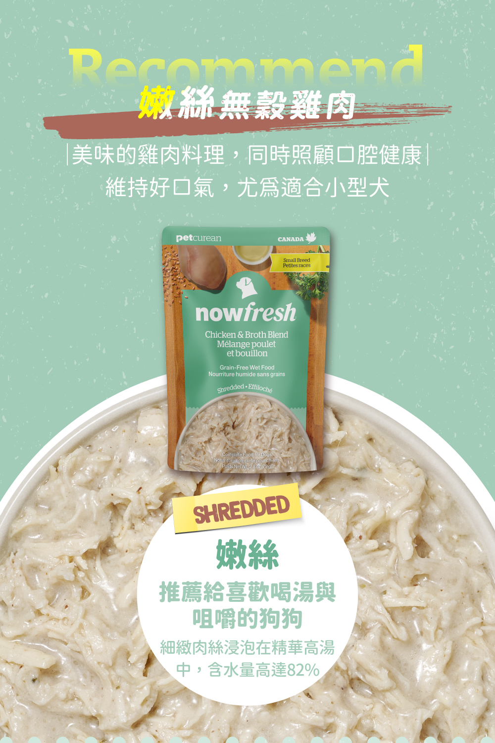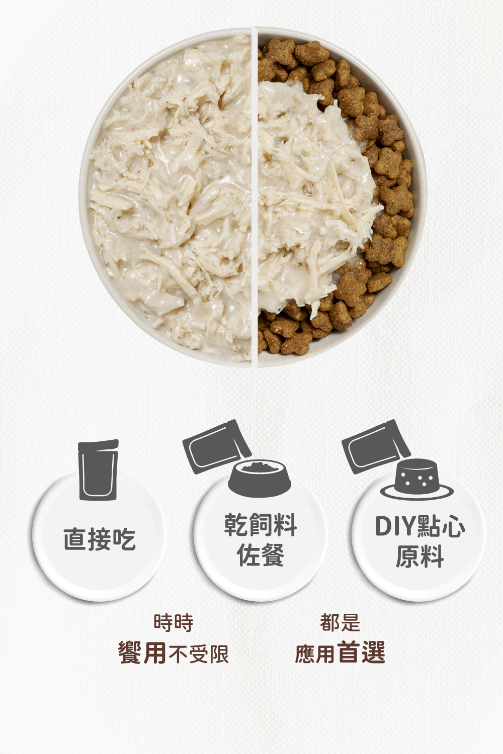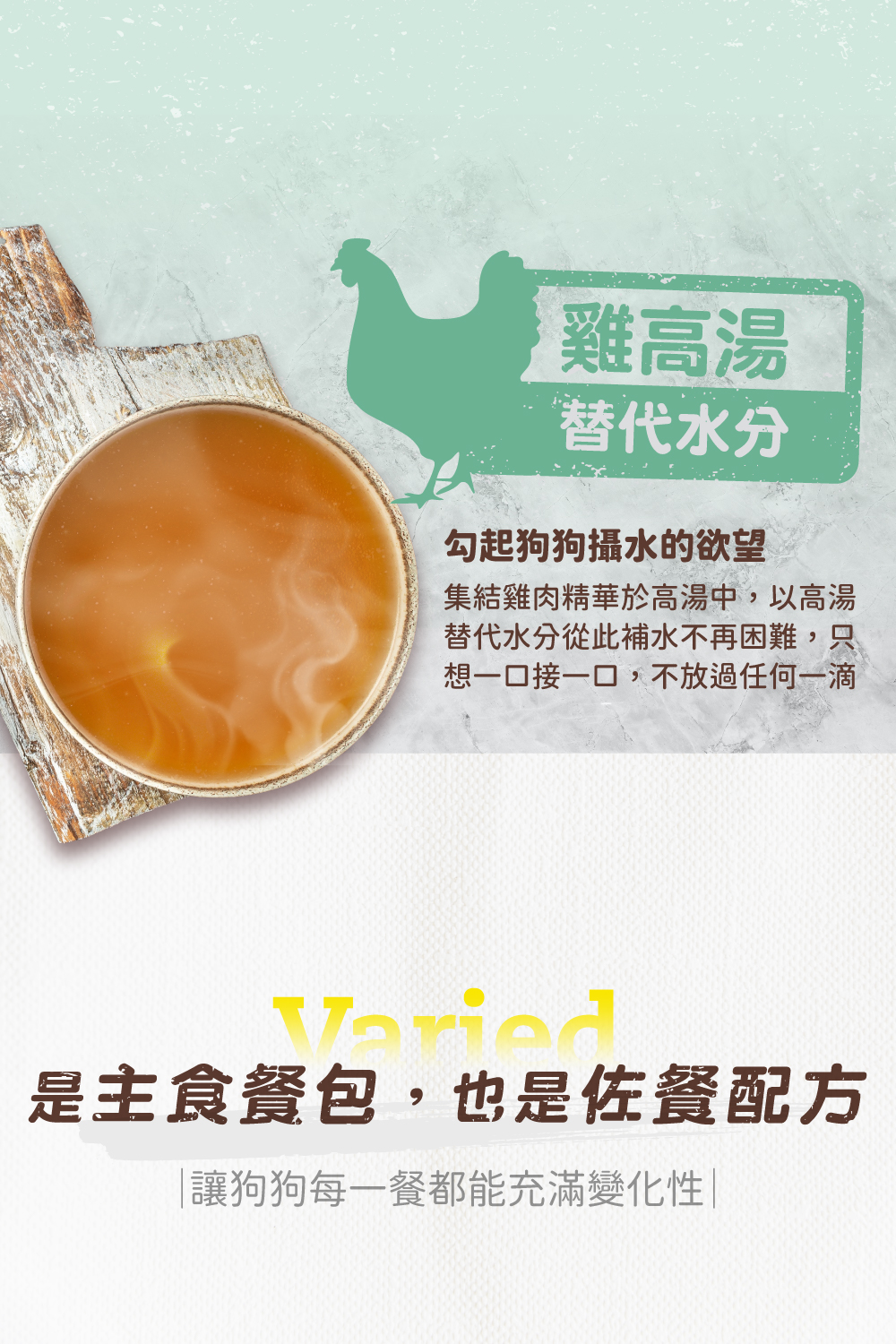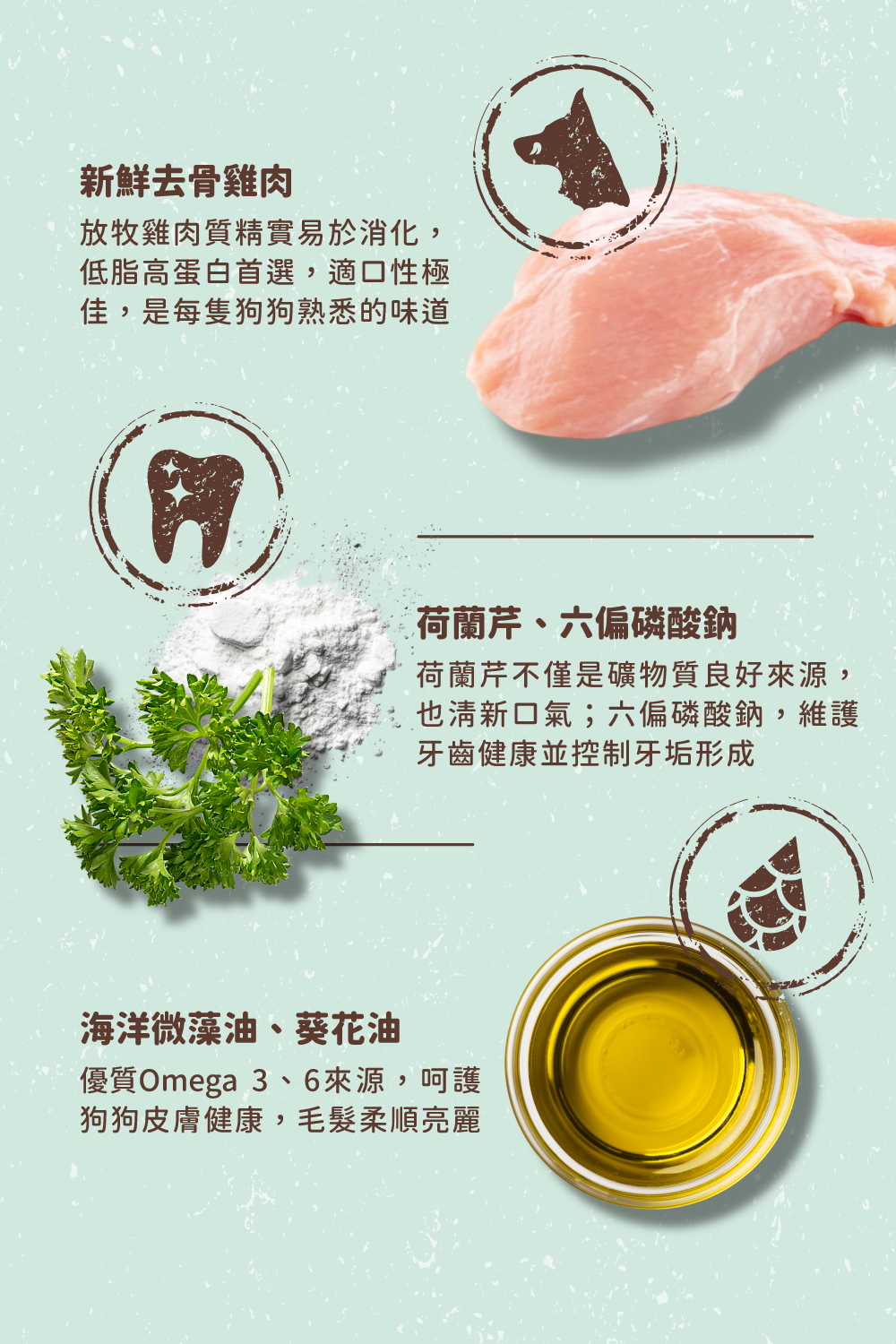 ●美味的雞肉料理,同時照顧口腔健康,維持好口氣,尤為適合小型犬 ●放牧雞肉質精實易於消化,低脂高蛋白首選,適口性極佳,是每隻狗狗熟悉的味道 ●細緻肉絲浸泡在精華高湯中,含水量高達82%,推薦給喜歡喝湯與咀嚼的狗狗 規格 建議售價 79g $79