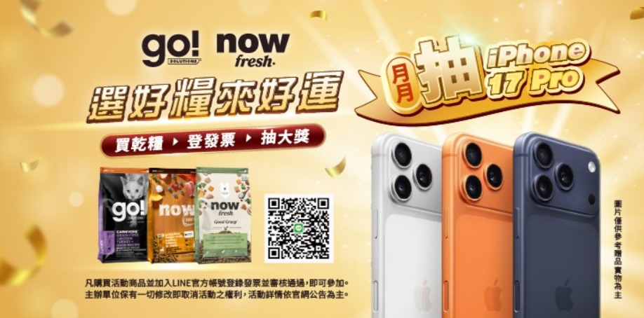 1. 活動商品:凡購買「go!」或「now」品牌之犬貓乾糧商品,且單包包裝規格為 3 磅 (3B) 以上者(不含「go! 全方位系列」) 。