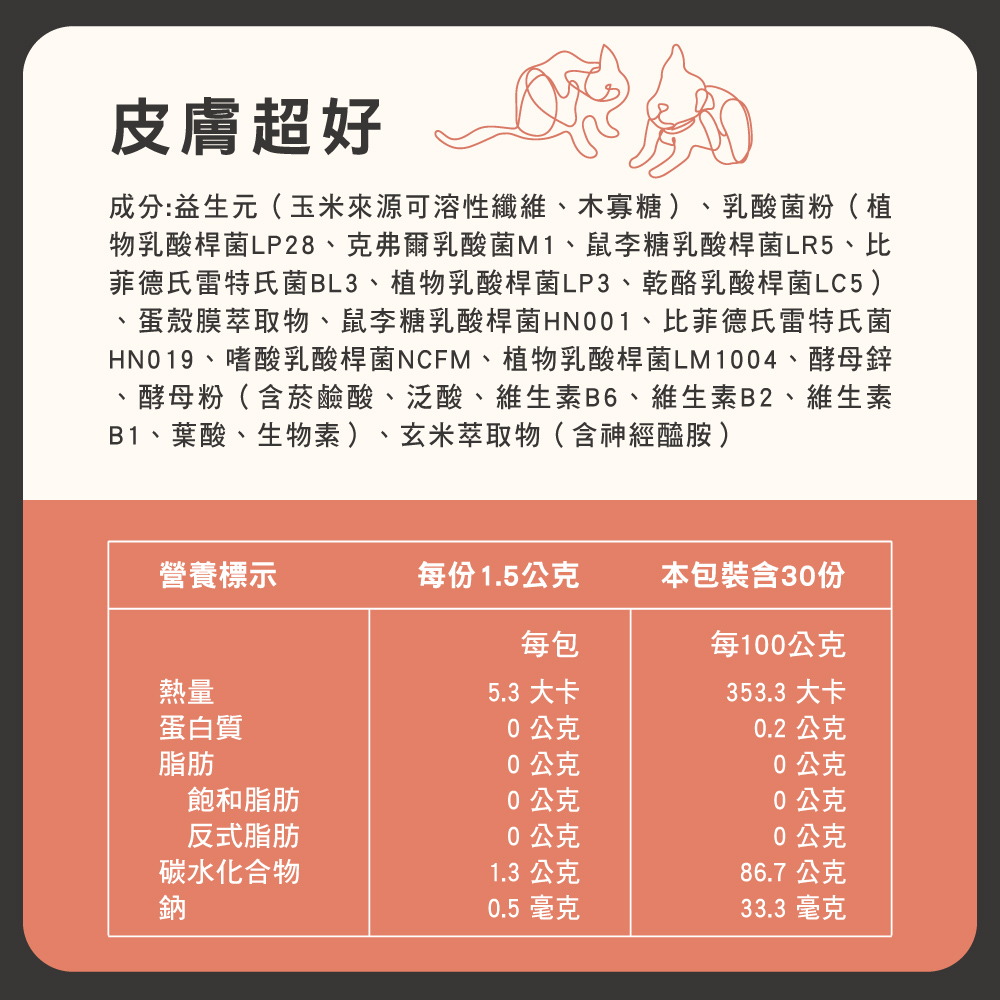 皮膚超好成分:益生元(玉米來源可溶性纖維、木寡糖)、乳酸菌粉(植物乳酸桿菌LP28 、克弗爾乳酸菌M1、鼠李糖乳酸桿菌LR5、比菲德氏雷特氏菌BL3、植物乳酸桿菌LP3、乾酪乳酸桿菌LC5)、蛋殼膜萃取物、鼠李糖乳酸桿菌HN001、比菲德氏雷特氏菌 HN019、嗜酸乳酸桿菌 NCFM、植物乳酸桿菌LM1004、酵母鋅、酵母粉(含菸鹼酸、泛酸、維生素B6、維生素B2、維生素B1、葉酸、生物素)、玄米萃取物(含神經醯胺) 規格 建議售價 1.5g/30包 $870