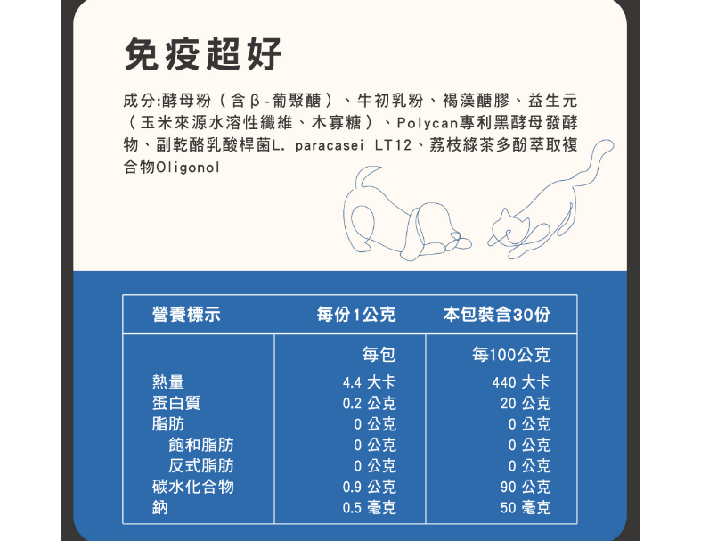 免疫超好成分:酵母粉(含β-葡聚醣)、牛初乳粉、褐藻醣膠、益生元(玉米來源水溶性纖維、木寡糖)、Polycan專利黑酵母發酵物、副乾酪乳酸桿菌L. paracasei LT12、荔枝綠茶多酚萃取複合物Oligonol 規格 建議售價 1.5g/30包 $1,135