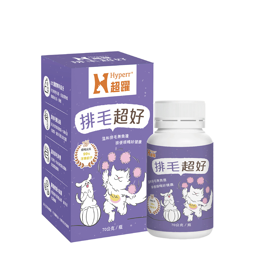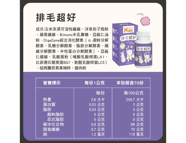 排毛超好成分:專利玉米來源可溶性纖維、洋車前子殼粉、蘋果纖維、專利Bimuno半乳寡糖、專利亞麻仁油粉、專利DigeZyme綜合消化酵素(α-澱粉分解酵素、乳糖分解酵素、脂肪分解酵素、纖維分解酵素、中性蛋白分解酵素)、亞麻仁纖維、專利乳酸菌粉 (嗜酸乳酸桿菌LA1、比菲德氏龍根菌BG7、乾酪乳酸桿菌LC5)、紐西蘭奇異果精粹、雞肉粉 規格 建議售價 70克/盒 $465
