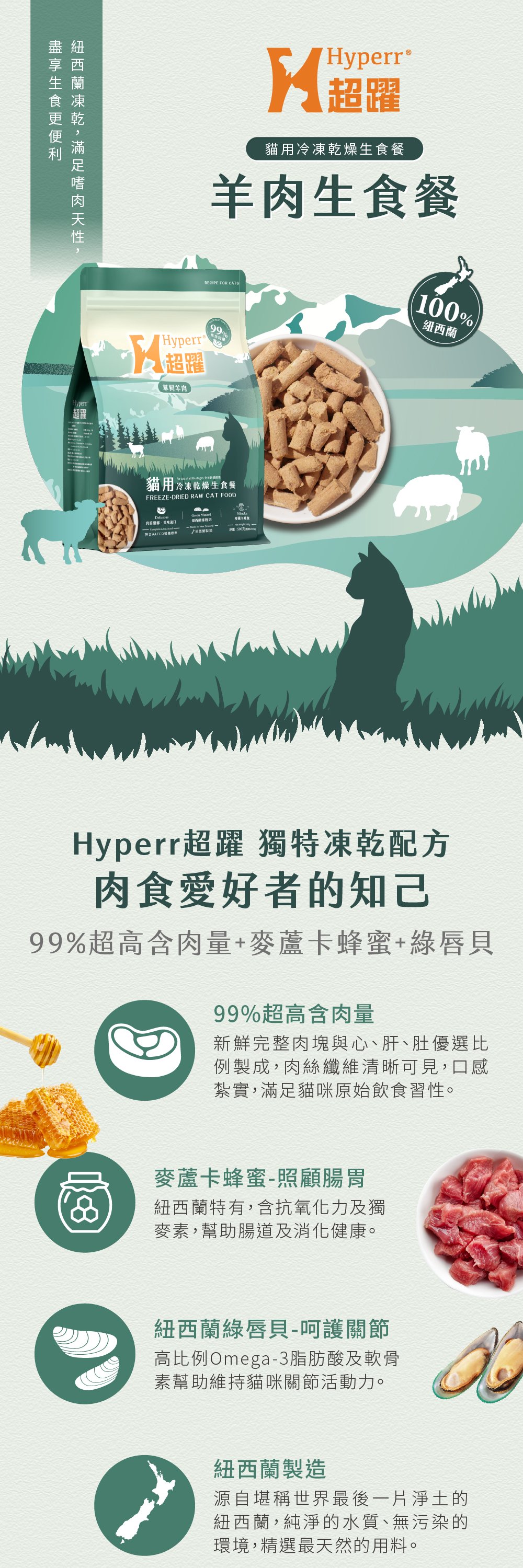 - 98%高含肉量,嚴選紐西蘭新鮮羊肉,豐富肉類蛋白質及胺基酸。