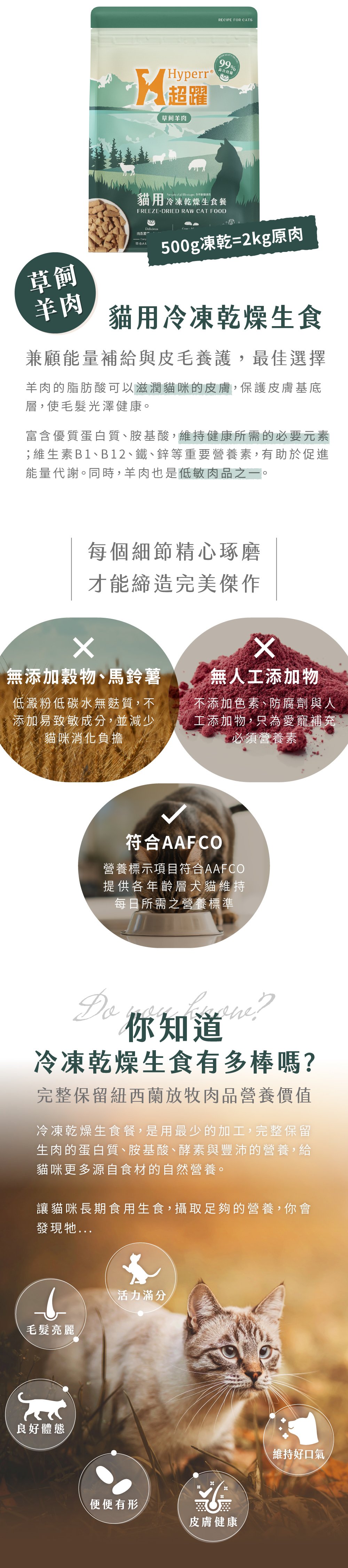 - 羊肉的脂肪酸可以滋潤貓咪的皮膚,保護皮膚基底層,使毛髮光澤健康。