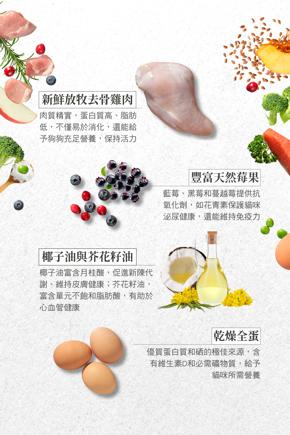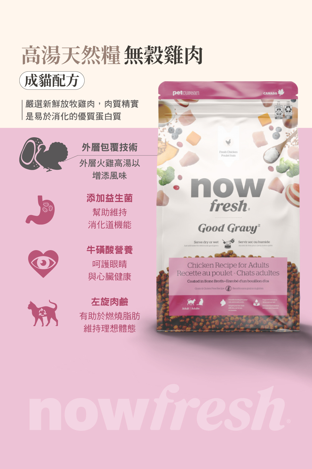 新鮮去骨肉塊製成的貓糧,外層包覆火雞高湯粉,香氣double、美味加分,是挑嘴貓咪最愛的選擇。 特別適合:挑嘴或平時不愛喝水的貓咪 TIPS:加水形成如燉飯的質地,不僅美味還補水。 乾乾直接吃或加水食用都講究 新鮮去骨放牧雞肉,肉質精實 牛磺酸保健心臟和視力 規格 建議售價 3B $1,840 8B $3,160