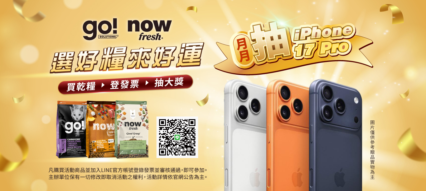 - 活動商品:凡購買「go!」或「now」品牌之犬貓乾糧商品,且單包包裝規格為 3 磅 (3B) 以上者(不含「go! 全方位系列」) 。