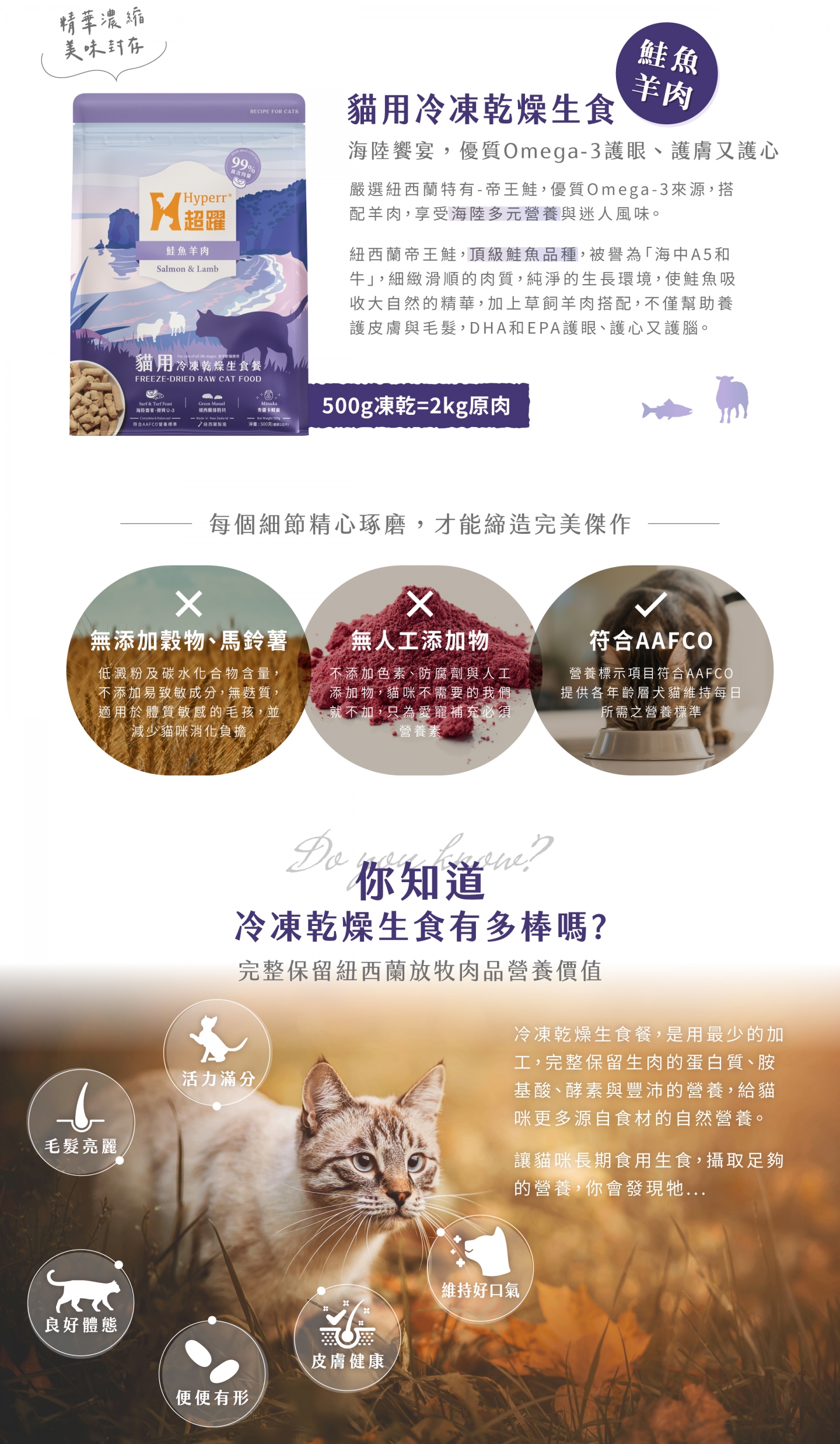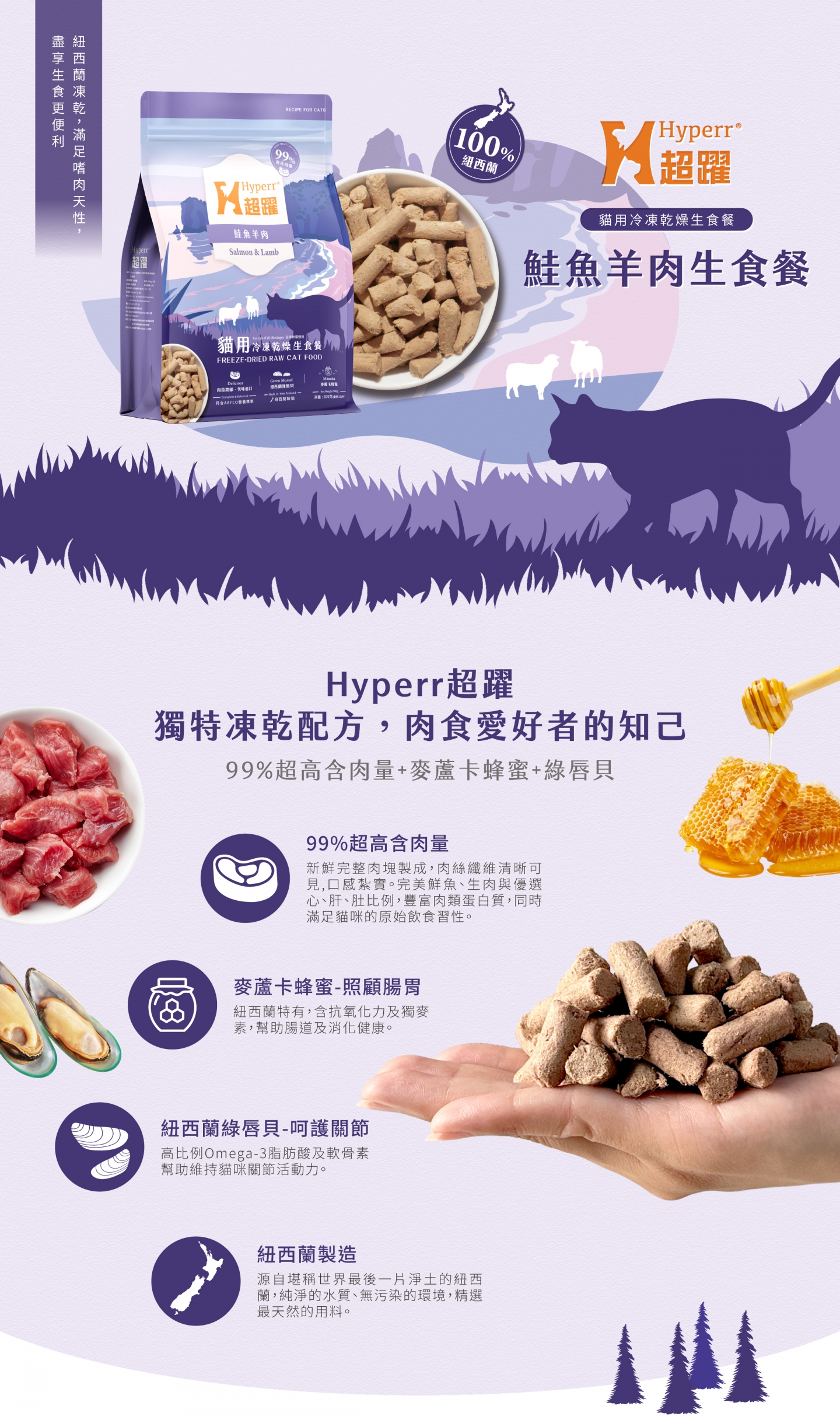 - 嚴選紐西蘭特有-帝王鮭,搭配草飼羊肉優質,優質Omega-3和6來源,享受海陸多元營養與迷人風味。