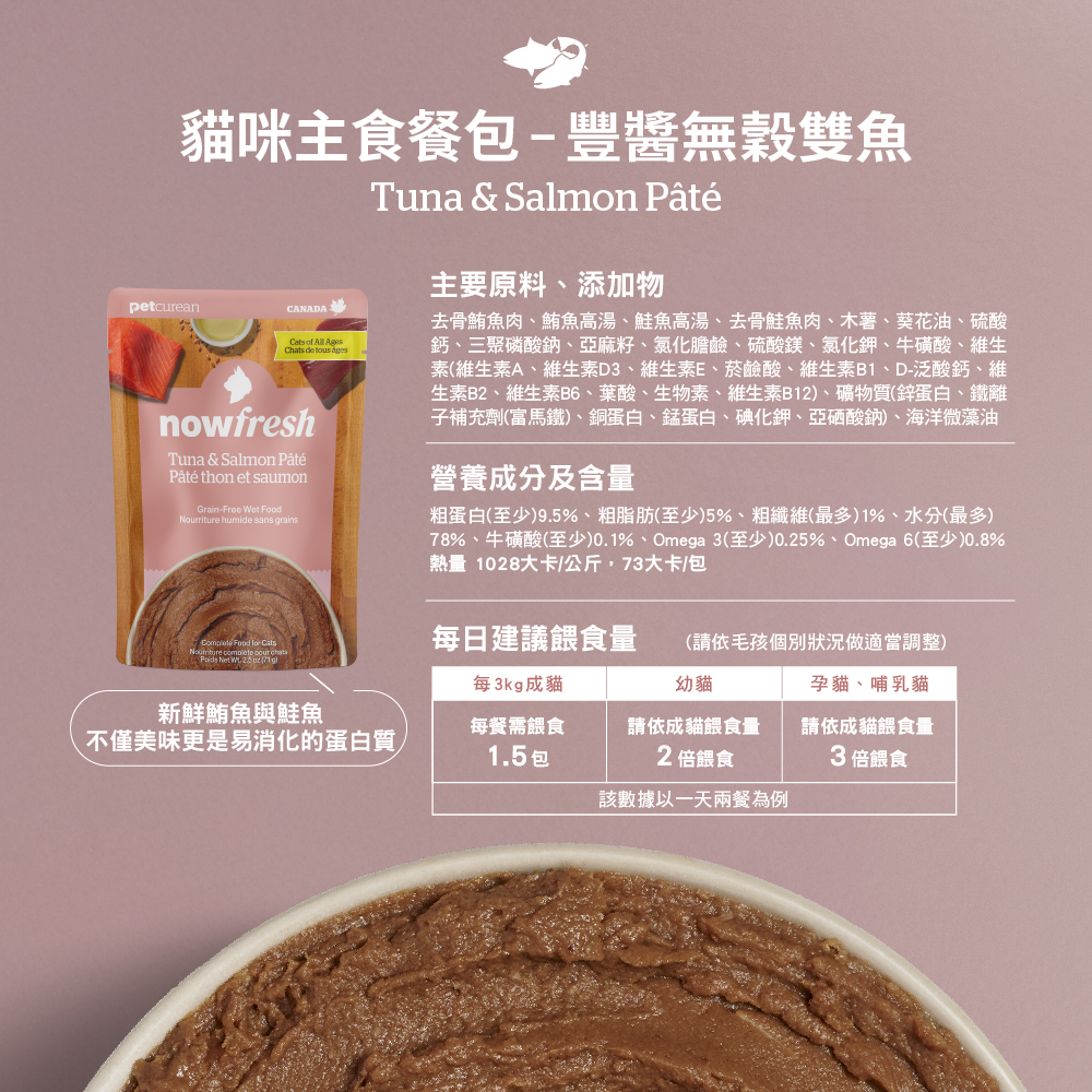 ●為愛吃魚的貓奉上頂級美味,滿足全年齡貓咪的口福 ●鮮嫩的鮪魚與鮭魚,不僅提供雙重魚肉蛋白質,還有豐富的DHA+EPA,吃得開心吃得美味 ●適合喜歡舔食的貓咪,將肉塊、食材與高湯拌成泥,口感綿密滑順 規格 建議售價 71g $79